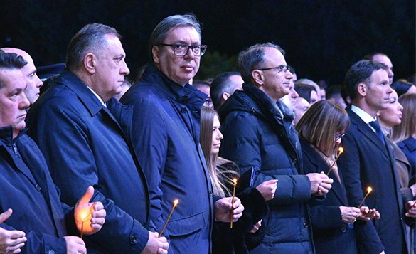 "Имали су пешадију на терену, албанске терористе које су до зуба наоружавали, имали су страшан утицај кроз све медије, тада посебним трансмитерима, пуштаним из околних земаља, бродова, Средоземље, одакле хоћете, за унутрашње рушење Србије. Баш као и некоћ, увек је било и много оних који су били добровољни поданици окупационих сила у нашем народу. Срећом, увек је највећи део нашег народа био слободарске оријентације и успевао да их победи", истакао је Вучић.